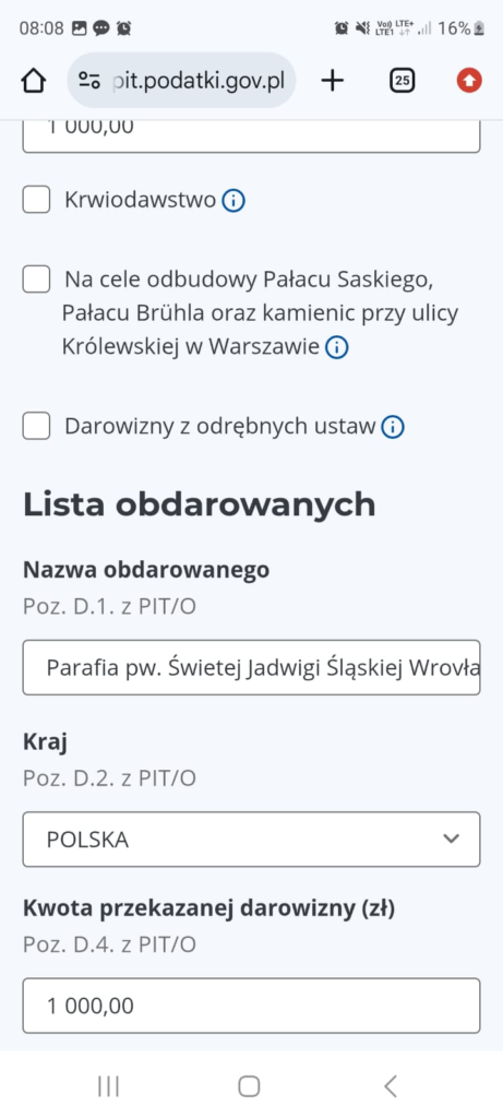W polu D.1.4 wpisz kwotę przekazaną na rzecz Parafii w ciągu całego roku.