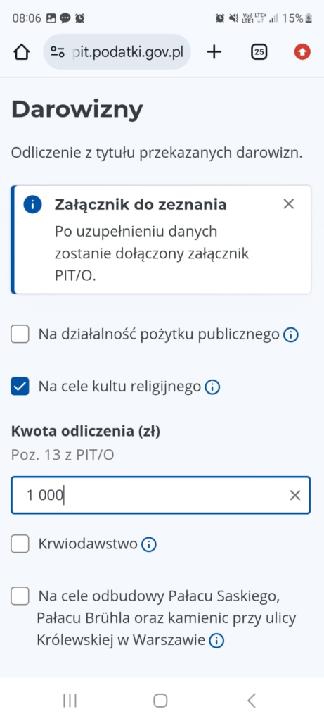 Darowizna przekazana na cele kultu religijnego jest odliczana od dochodu w PIT, co zmniejsza podstawę opodatkowania.Aby rozliczyć darowiznę w PIT, należy dołączyć do rocznego zeznania (PIT-37, PIT-36, PIT-28) załącznik PIT/O. W tym załączniku wykazuje się kwotę darowizny oraz dane obdarowanego. Odliczenie dotyczy darowizn na cele pożytku publicznego, kultu religijnego, krwiodawstwa i wynosi w sumie maksymalnie 6% dochodu.Aby udokumentować darowiznę wpłaconą na rzecz parafii wystarczy dowód wpłaty (w tytule przelewu powinno być wskazane- darowizna na cele kultu religijnego)Skorzystasz z ulgi rozliczając się PIT-37, PIT-36, PIT-28. Przedsiębiorcy na podatku liniowym (PIT-36L) nie odliczą darowizny od dochodu. Do zeznania należy dołączyć załącznik PIT/O i wypełnić go w kilku krokach: